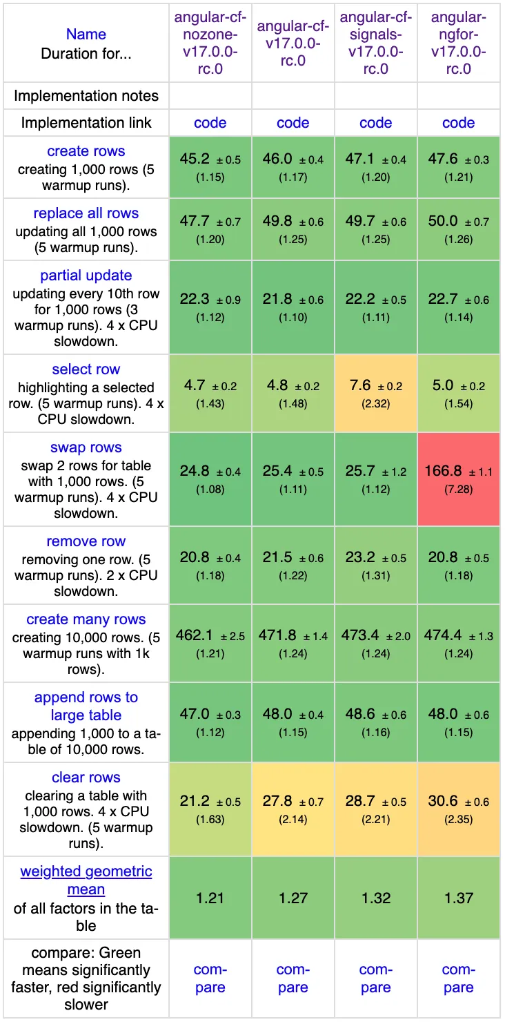 @for 구문은 *ngFor와 달리 새로운 비교 알고리즘을 사용하며, 최적화에도 신경썼기 때문에 이전보다 최대 90% 빠른 런타임 성능을 자랑합니다! 벤치마크 결과를 확인해 보세요.